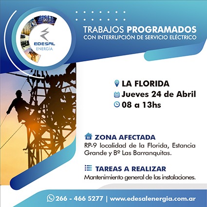 La Florida: Corte del servicio eléctrico este jueves 24 de abril.Será en el horario de 8 a 13 hsVer zona afectada en el siguiente flyer