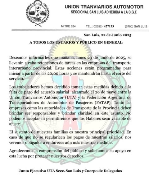 A través de un comunicado la Seccional UNION TRANVIARIOS AUTOMOTOR (UTA) Seccional San Luis, informó que este lunes 23 de junio de 2025, se llevarán a cabo retenciones de tareas en las empresas del transporte interurbano provincial.