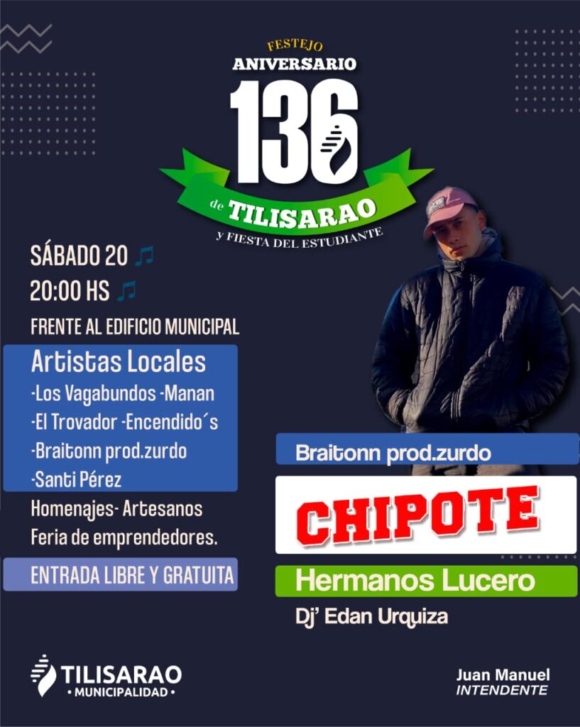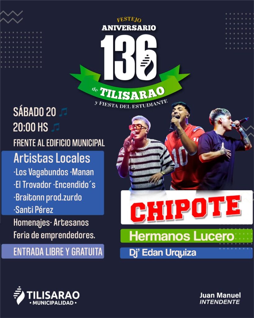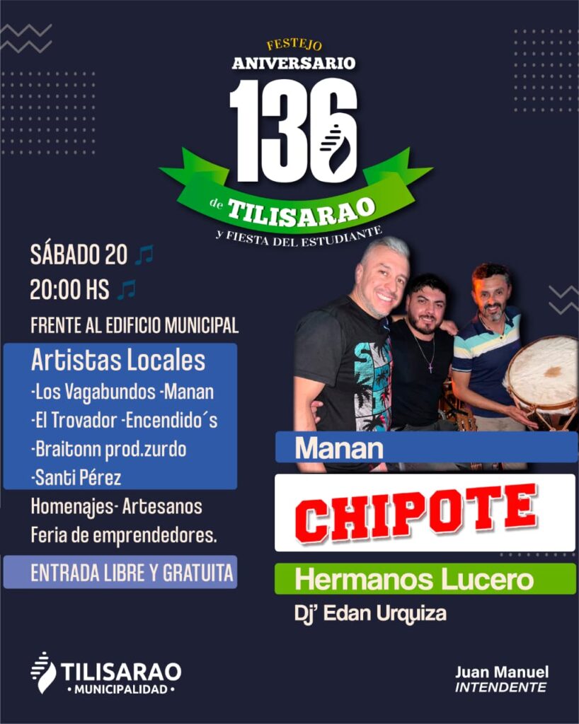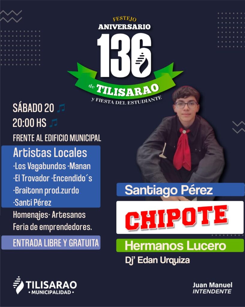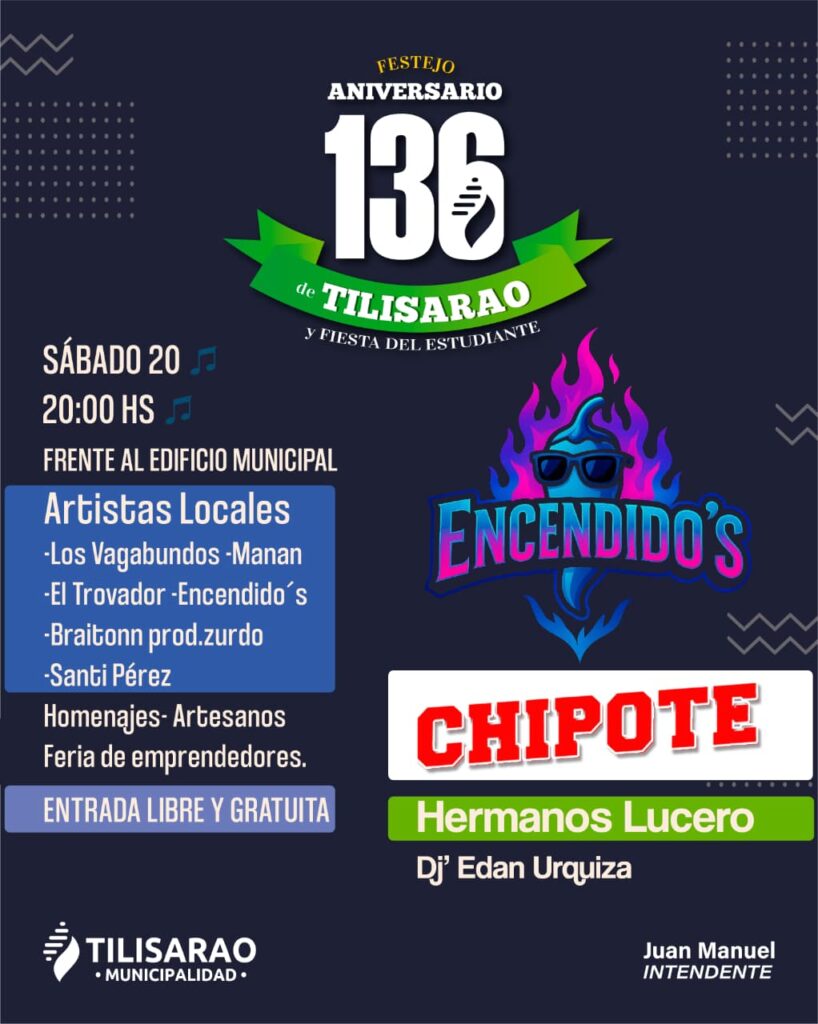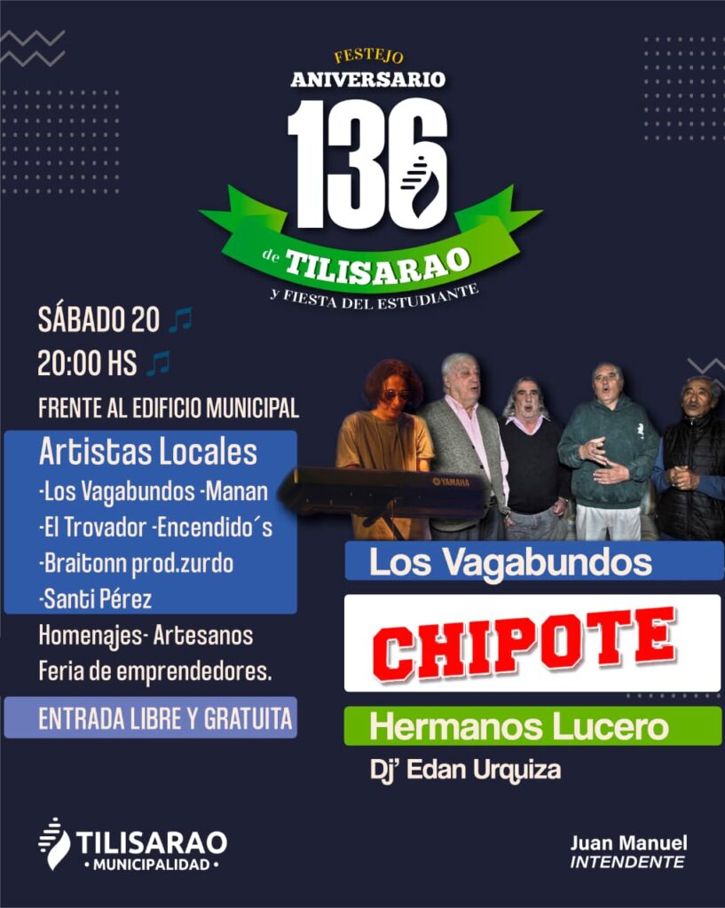Este sábado 20 de septiembre, a partir de las 20:00 horas, frente al edificio municipal, Tilisarao vivirá una noche especial en el marco de los festejos por el 136° aniversario de la localidad, coincidiendo además con la Fiesta del Estudiante.