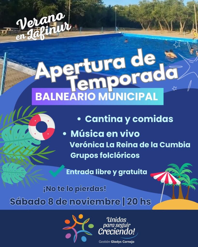 La municipalidad de Lafinur invita a todos los vecinos y a visitantes de otras localidades a disfrutar del inicio de la temporada turística 2025 en el balneario municipal, el próximo sábado 8 de noviembre, desde las 20:00. Será una noche especial con música en vivo, cantina y comidas rápidas.