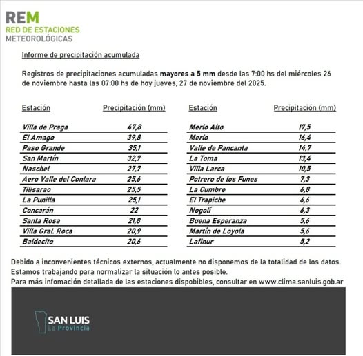 VECINOSDELINTERIOR.COM / 27 DE NOVIEMBRE Villa de Praga fue la localidad más beneficiada con más de 47 mm. Le siguieron El Amago con 39.8 mm, Paso Grande con 35.1 mm y San Martín con 32.7mm La lluvia trajo algo de alivio ante una ola de calor que se registraba en toda la provincia.