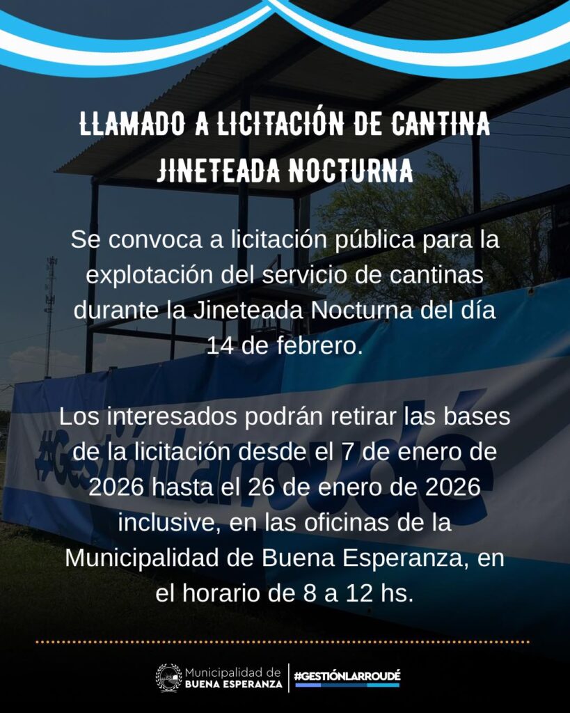 El municipio de Buena Esperanza informó que se encuentra abierta la licitación pública para la explotación del servicio de cantina durante la Jineteada Nocturna.