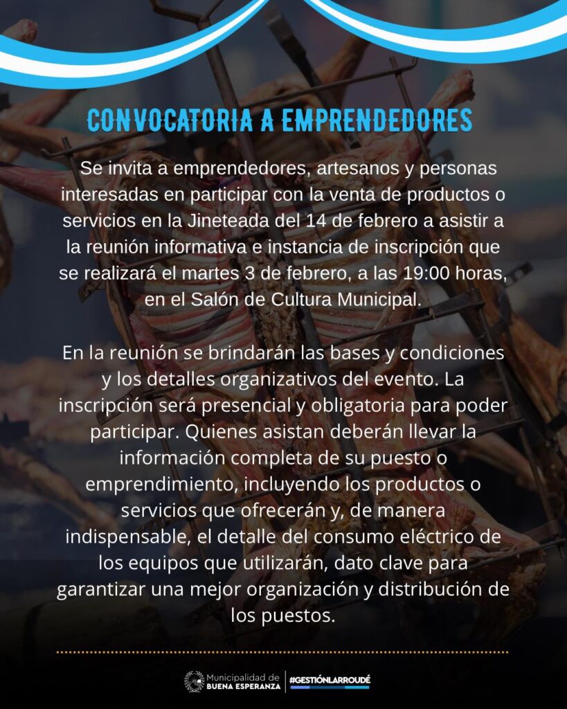 Se invita a emprendedores, artesanos y personas interesadas en participar con la venta de productos o servicios en la Jineteada del 14 de febrero a asistir a la reunión informativa e instancia de inscripción que se realizará el martes 3 de febrero, a las 19:00 horas, en el Salón de Cultura Municipal.