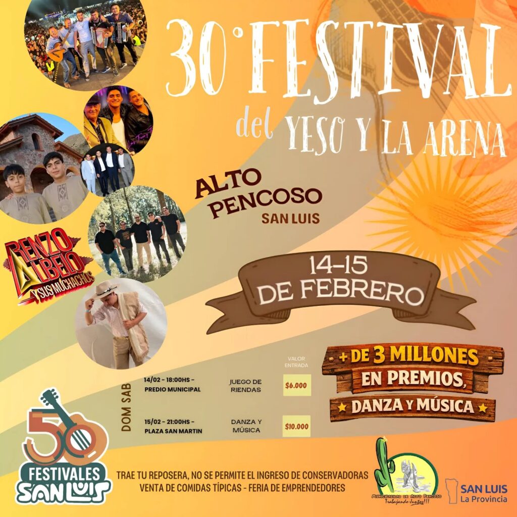Este sábado, las familias de Alto Pencoso se preparan para recibir el 30° Festival del Yeso y la Arena, desde las 18:00 en el predio municipal. El domingo a las 21:00, el festival se trasladará a la plaza San Martín. Las entradas tendrán un costo de $6.000 y $10.000.