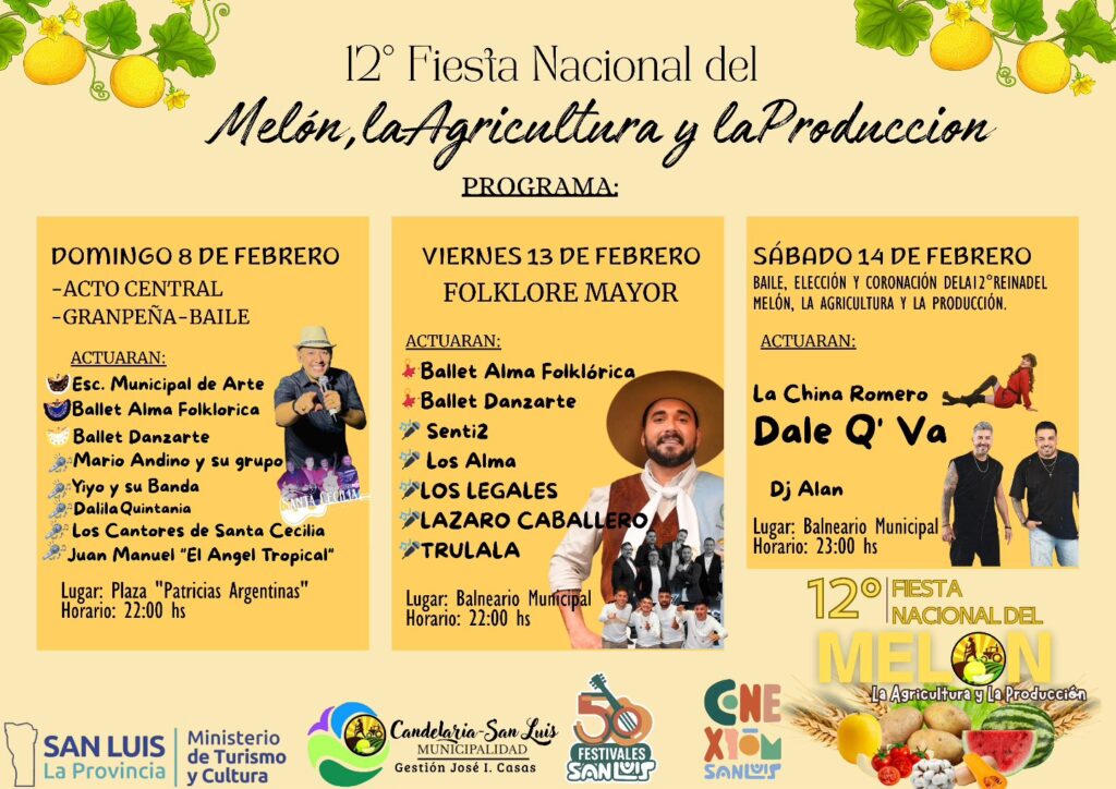 Este viernes 13 y sábado 14, Candelaria desarrollará dos veladas del 12° Festival Nacional del Melón, la Agricultura y la Producción. El costo de la entrada es de $10.000 y se permitirá el ingreso de equipos de mate y reposeras, pero no de conservadoras.