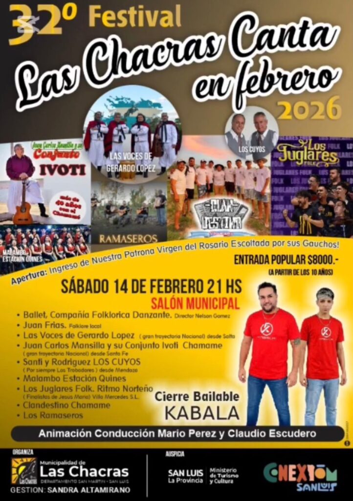 Este sábado, en el salón municipal de Las Chacras, los vecinos se preparan para recibir la 32° edición del Festival Las Chacras Canta en Febrero. Las entradas tienen un valor de $8.000 y menores de 10 años no abonan. Desde la municipalidad, a través de sus redes sociales, comunicaron que estará prohibido el ingreso de conservadoras.