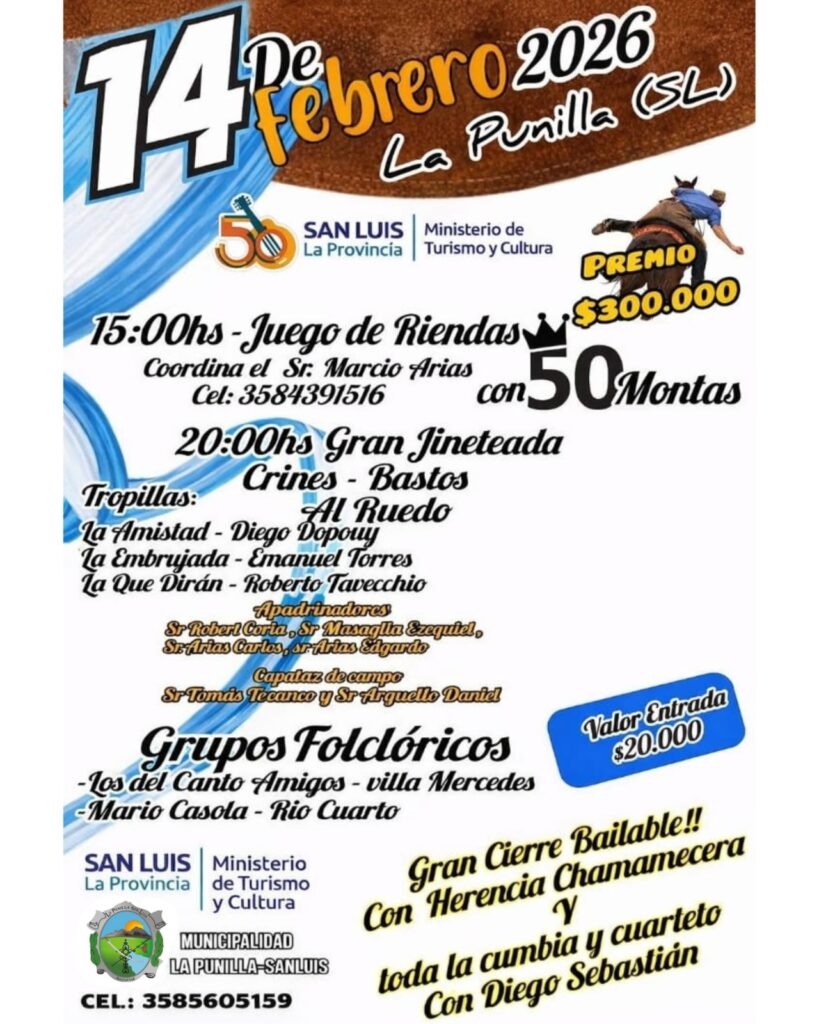 La Punilla, este sábado 14 de febrero, celebrará el Festival de Doma y Folclore. A partir de las 15.00, se llevará a cabo un juego de riendas con 50 montas. A las 20:00, se realizará la gran jineteada con crines, bastos y al ruedo. La entrada tiene un valor de $20 mil.