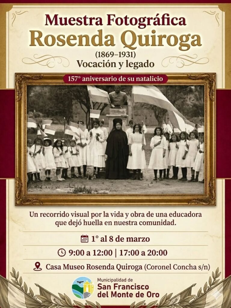 En el marco del 157° aniversario del natalicio de Rosenda Quiroga, se inaugurará la muestra fotográfica “Rosenda Quiroga (1869–1931). Vocación y legado”, una propuesta que invita a la comunidad a conocer y valorar la vida y trayectoria de esta destacada educadora sanfrancisqueña. La iniciativa busca rescatar su aporte a la educación y mantener vigente su legado en la historia local.