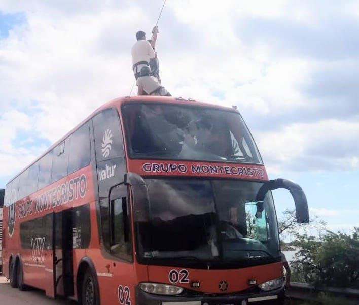 Al llegar al lugar, los uniformados observaron que la mujer y el hombre se encontraban suspendidos en los arneses de la tirolesa, tras haber impactado contra la parte frontal de un ómnibus que estaba estacionado en la zona.