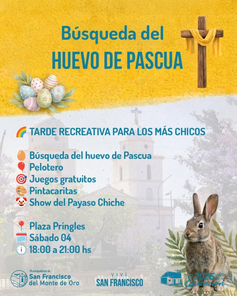 La actividad, libre y gratuita, contará con una variada agenda que incluye búsqueda del huevo de Pascua, pelotero, juegos recreativos, pintacaritas y el esperado show del Payaso Chiche, que promete sacar sonrisas y sorprender a grandes y chicos.