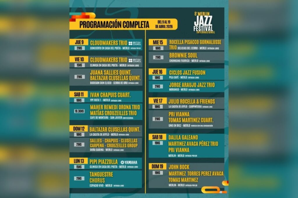 A lo largo de los 11 días de programación, el festival ofrecerá conciertos de artistas nacionales e internacionales, clínicas y actividades formativas, presentaciones en múltiples sedes, experiencias culturales vinculadas al paisaje y la identidad local. La grilla completa y detallada se puede visualizar en la página de instagram @merlin_jazz_festival. Mientras que las entradas se pueden adquirir aquí https://qrticket.app/e/Merlin-Jazz-Festival-2026.