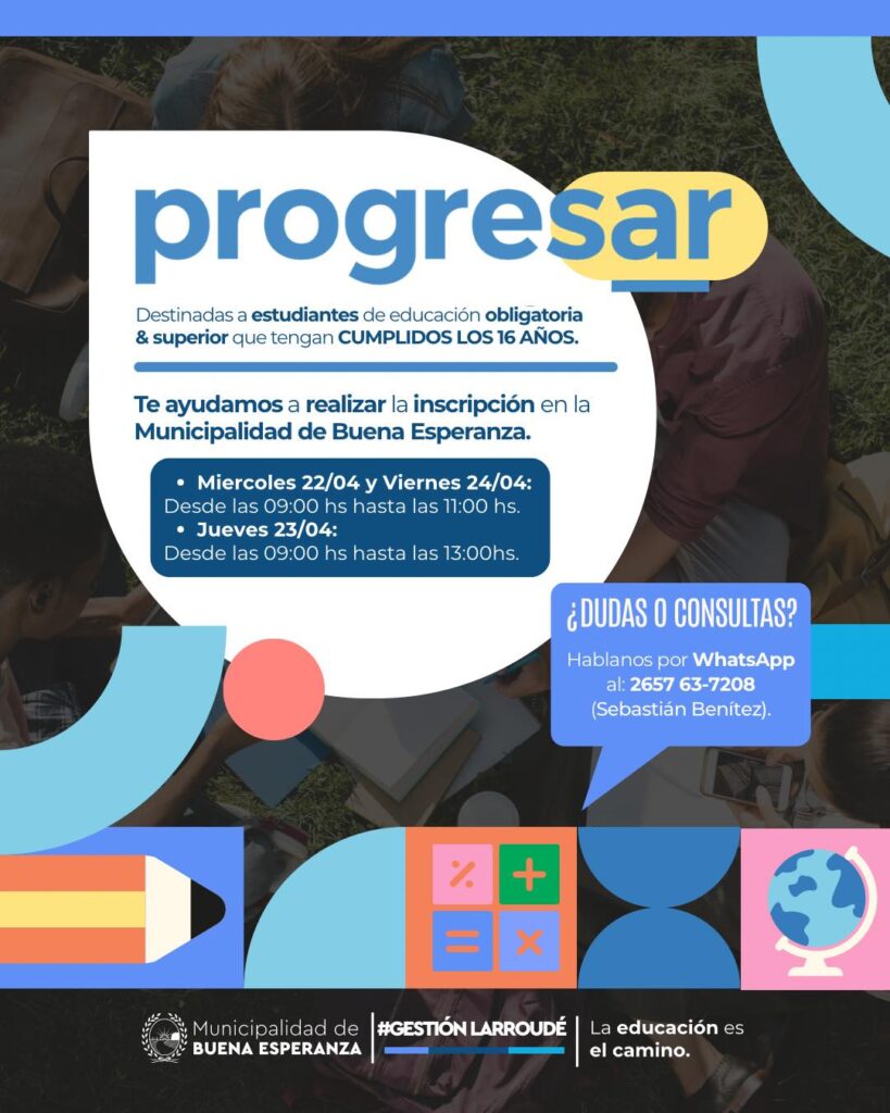 La Municipalidad de Buena Esperanza lanzó una convocatoria destinada a jóvenes mayores de 16 años que se encuentren estudiando, con el objetivo de facilitar su inscripción al programa Progresar. La iniciativa busca acompañar a los vecinos en el proceso de postulación de manera simple y accesible.