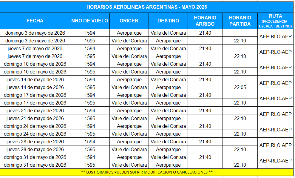 – Vuelo AR1594: Aeroparque – Valle del Conlara (arribo 21:40).